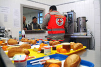 Serge et trois jeunes étudiants bénévoles s’activent en cuisine. Durant deux heures et 5 jours sur 7, la Croix-Rouge offre le petit-déjeuner ; un plateau copieux et équilibré, composé de pain, d’un croissant, de beurre, de confiture, d’un fruit, d’un laitage, d’un thé, d’un chocolat ou d’un café, le tout à la demande. Seule association ouverte le week-end, elle distribue jusqu’à 250 repas par jour, contre 60 à 80 en semaine.