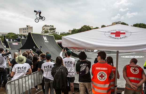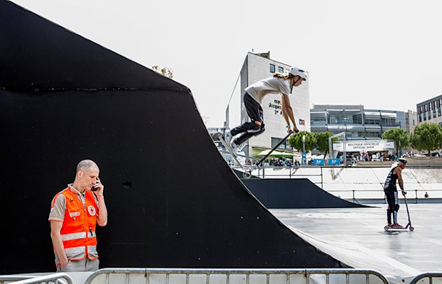 « Le truc de fou avec le FISE, c’est que, vu les prouesses techniques des athlètes engagés, on n’a surtout pas envie que les gars - et les filles - se fassent mal… et qu’en même temps on rêve d’intervenir. L’adrénaline de l’événement déteint sans doute un peu sur nous ! », observe Athénaïs, 18 ans, depuis la rive opposée. Soudain, la radio de Sofiane, son chef d’équipe, grésille –appel du PC (le poste de commandement). Les quatre compères de l’équipe mobile entament une course de 800 mètres au milieu de la foule, dense. Skate à la main et casquette vissée sur le crâne, un enfant a chuté entre deux barrières. Sa mère est inquiète. Le bilan est rassurant - plus de peur que de mal finalement. Un coup de spray désinfectant et un pansement plus tard, le petit gars peut repartir admirer ses idoles.