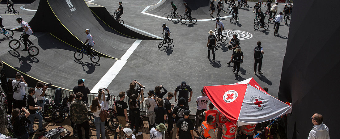 Guillem lui, file avec son équipe prendre place au pied des rampes de BMX. Le poste est l’un des plus impressionnants du dispositif, les riders s’envolant parfois à plus de six mètres dans les airs… Le risque de chute y est donc maximum.