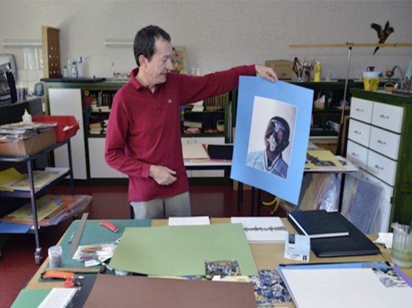 Cet été, un artiste plasticien a investi les murs de l’établissement durant un mois, du 10 juillet au 11 août. « J’interviens directement dans l’établissement en accrochant des œuvres dans des lieux choisis, explique Guy Limone. Je propose également des ateliers quotidiens à ceux qui le souhaitent. Nous travaillons autour de la couleur par le biais de découpages, collages, l’apport d'images prélevées dans des magazines, l’écriture. Le choix des images n’est jamais anodin. Cela permet aux participants de s’exprimer et de respirer ! », constate l’artiste. Les bienfaits de ces séances sont incontestables. « La première fois que je suis venue, je ne pouvais pas utiliser ma main gauche, on m’a donc montré une autre technique pour découper les images, témoigne Salima. Je trouve cet atelier magnifique ! ». « Ca me permet d’oublier les soins, de penser à autre chose », dit Janine, une autre résidente. « C’est une distraction, mais cela nous redonne confiance en nous, raconte Christine. On se sent tellement diminués que l’on est heureux d’être encore capables de faire quelque chose ! Moralement et psychologiquement, cela fait beaucoup de bien. » Retrouver foi en soi, en ses capacités, une autre vertu de la création artistique. A la table de l’atelier, Marguerite, qui a perdu l’usage de la parole, s’applique à compléter sa réalisation, où le bleu domine. « Pour elle, le collage est un vecteur d’expression important », explique le plasticien, entre deux conseils ou coups de ciseaux.