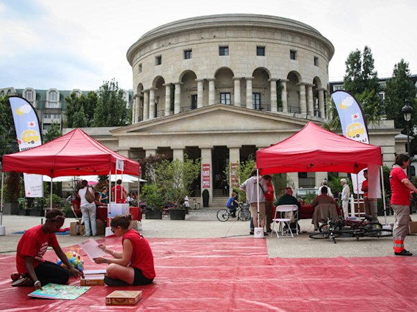 Chaque étape vise un objectif précis. A Paris, la Croix-Rouge française espère être la plus visible possible pour attirer de nouveaux bénévoles.La journée commence sous un ciel gris, presque pluvieux ; pas très engageant. Malgré une matinée maussade, des personnes s'arrêtent, intriguées par le dispositif de la Croix-Rouge française. Une petite dizaine de tentes rouges sont installées aux abords des quais ; chacune propose une formation.Au total, il y en a six :