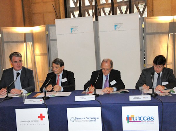Le professeur Jean-François Mattei, président de la Croix-Rouge française, Patrick Kanner, président de l’Union nationale des centres communaux d’action sociale (UNCCAS) et François Soulage, président du Secours Catholique, ont présenté conjointement, mercredi 7 décembre à Paris, le Manifeste pour l’inclusion bancaire en France des populations fragiles. Objectifs : rendre visible le phénomène, pointer les besoins en termes de politiques publiques, le manque de moyens privés, proposer, enfin, des solutions concrètes.