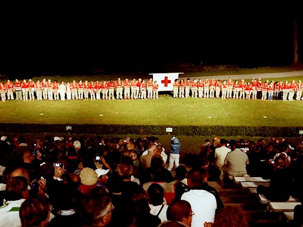 C’est à l’invitation des 700 bénévoles du spectacle que les bénéficiaires de la Croix-Rouge française de la région Nord-Ouest ont répondu. Cette représentation privée leur était dédiée et offerte. C’est la cinquième fois que cette opération a lieu, la première remonte à 1998, sous l’impulsion de la région Picardie et plus particulièrement de Pierre Lacour, aujourd’hui vice-président de la direction régionale et trésorier national de la Croix-Rouge française. « Le plus difficile, c’est d’acheminer les personnes sur le site, car la plupart vit dans une situation très précaire, sans moyen de transport. Et puis, organiser un pique-nique géant n’est pas simple ! », explique Pierre Lacour. Au total, une soixantaine de bus a été affrété pour transporter les 3000 passagers, dont dix véhicules venus de l’Oise avec 600 personnes à bord. Nathalie Dada, bénévole de la délégation départementale, a géré ce déplacement : « tout s’est bien passé, tout le monde a tenu ses engagement. Cela a permis de constituer des groupes et aux gens de se rencontrer dans un autre contexte que celui de la distribution alimentaire. Ce soir, il n’y a ni bénéficiaires ni bénévoles, mais uniquement des personnes venues partager un bon moment. »