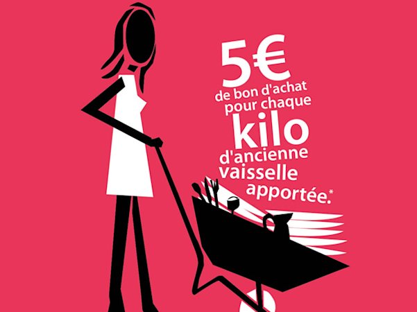 Toute l’opération consiste à venir avec son ancienne vaisselle (assiettes, verres, couverts…) dans les magasins partenaires… Le principe? Pour chaque kilo de vaisselle apporté, vous aurez droit à un bon d’achat de 5 euros à valoir sur la vaisselle neuve dans les boutiques participantes.