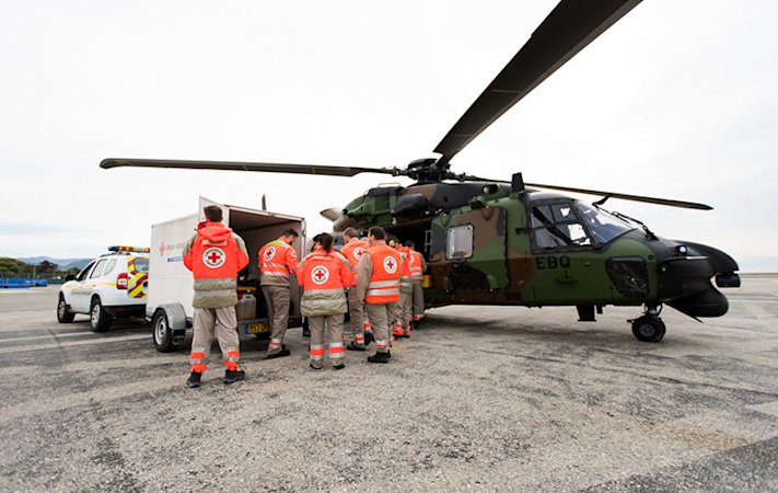 Les volontaires Croix-Rouge déployés dans les Alpes-Maritimes auprès de la population après le passage de la tempête Alex participent aux rotations en hélicoptère avec des kits d'urgence.