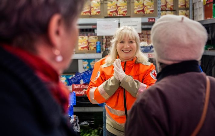 Zina est une boule d’énergie. Elle irradie dans sa chasuble Croix-Rouge, s’active sans ménagement parmi les autres bénévoles, au milieu des étagères remplies et des cagettes de légumes. Elle rit à gorge déployée, Zina, et détend l’atmosphère avant le rush. Dès que les premiers arrivants affluent à l’entrée commence alors un ballet continu de sacs, de caddies, de paniers et de discussions dans toutes les langues. Zina s’est imposée par cette énergie et cette volonté d’aider qui l’habitent et elle a trouvé en ces murs une raison de se lever le matin. Le président de l’unité locale, Jean-Jacques Muller, l’a vite compris. Lui et son équipe ont repéré les qualités de Zina lors de son stage en immersion professionnelle. Durant ce stage de trois semaines, les personnes viennent pratiquer le français à travers des activités – domiciliation, aide alimentaire ou vestimentaire. « Zina a aussitôt exprimé son désir d’être bénévole », se souvient le responsable de la structure, « et on a accepté, même si son français laisse encore à désirer ! Elle est incroyable ! »